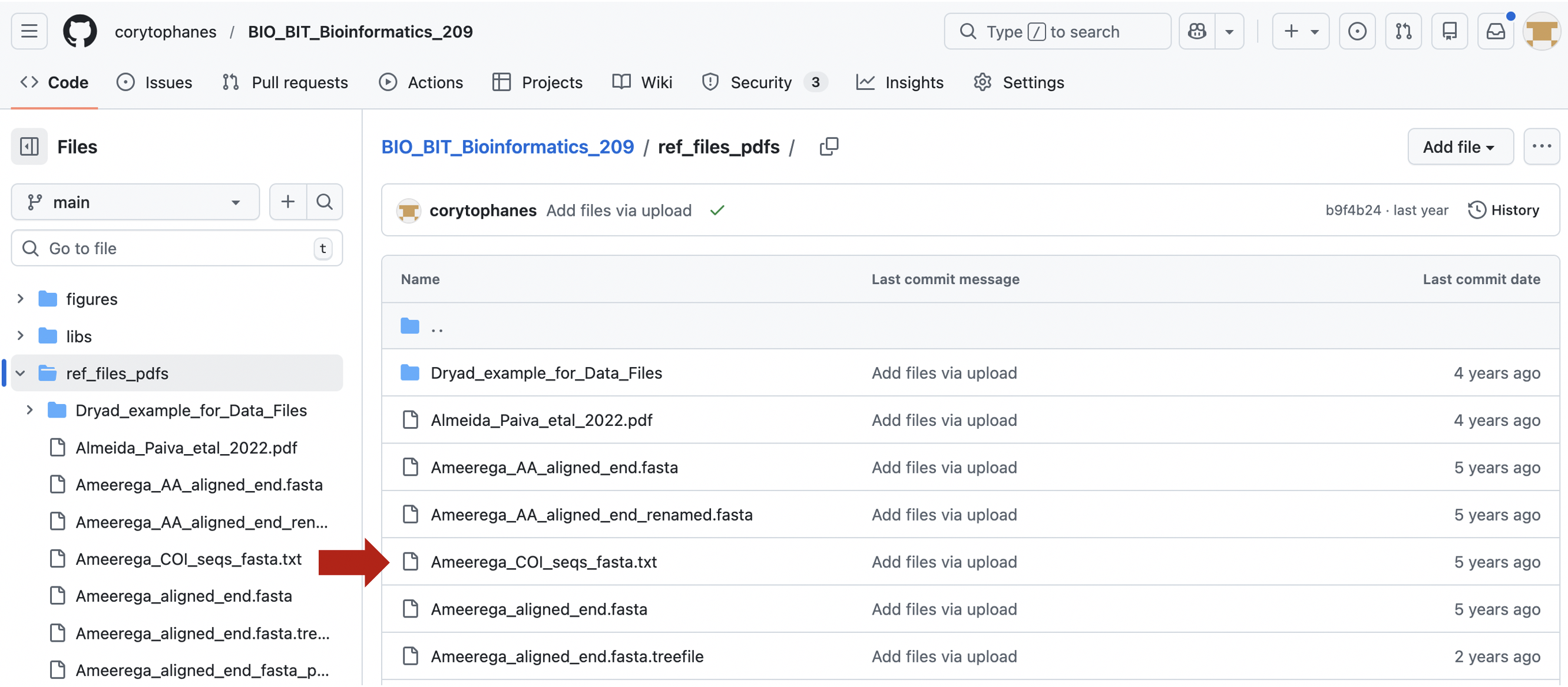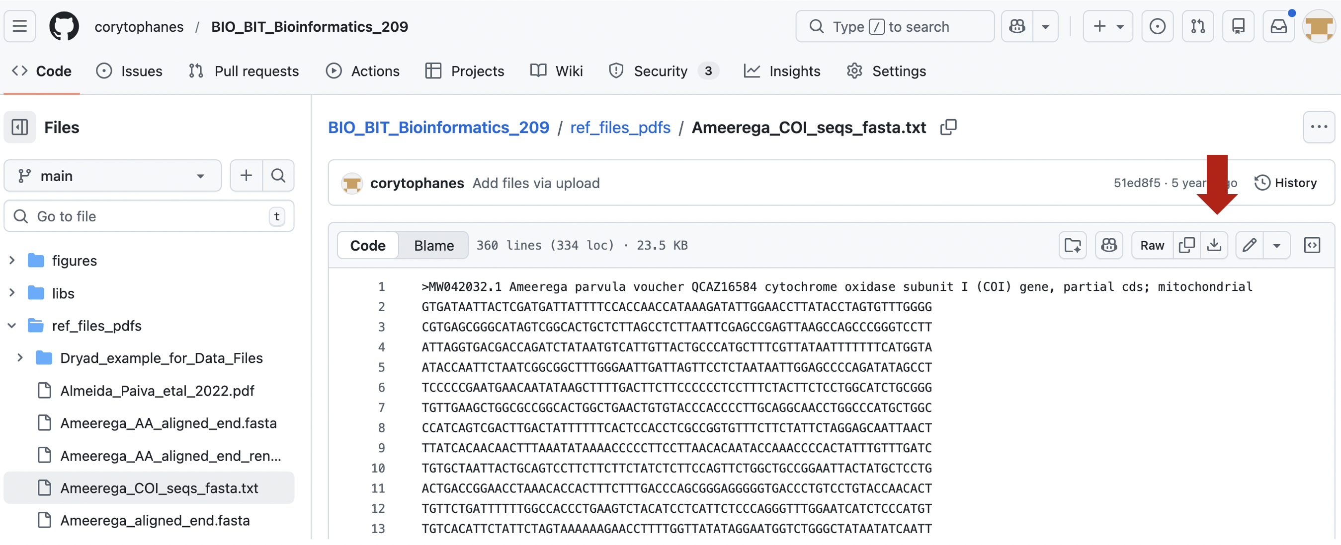 1) Go to the file you want to download. Click on the file that you want to download. For example, Ameerega_COI_seqs_fasta.txt. You will see the file contents.